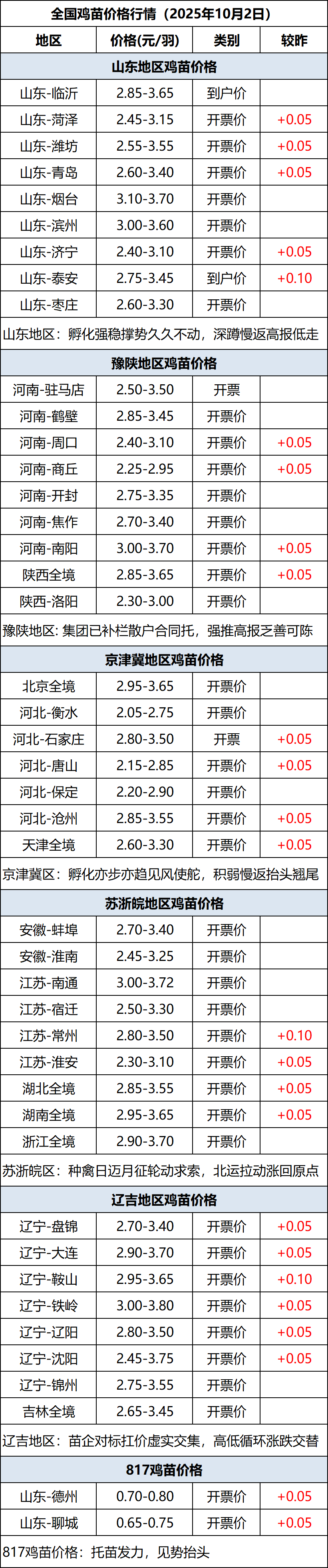 10月2日全国鸡苗(肉鸡)价格行情(涨价)