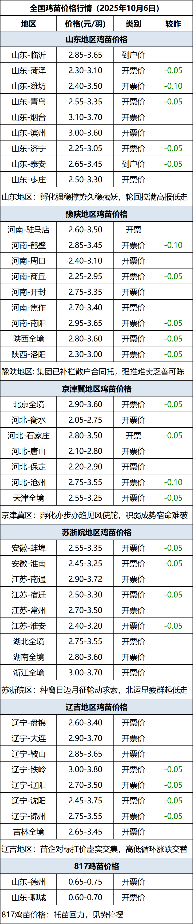 10月7日全国鸡苗(肉鸡)价格行情(落价)