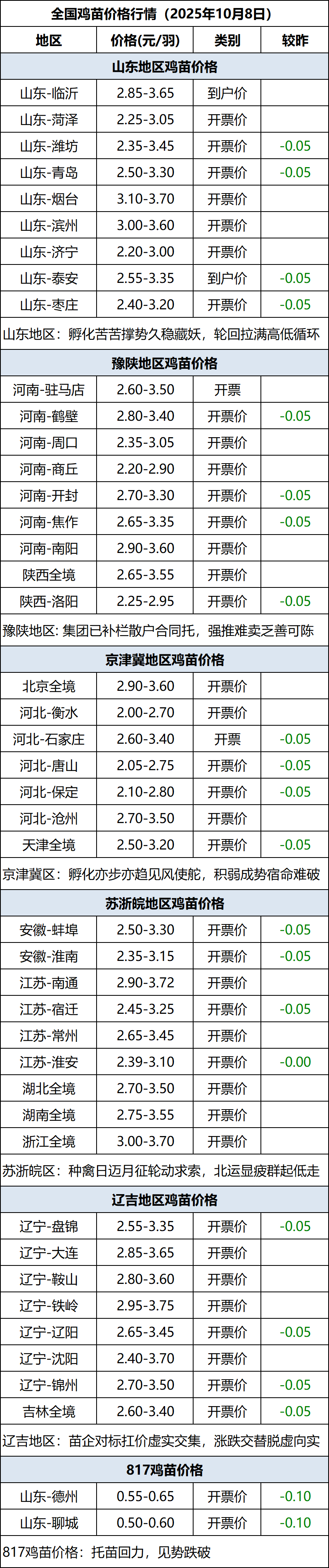 10月8日全国鸡苗(肉鸡)价格行情(落价)