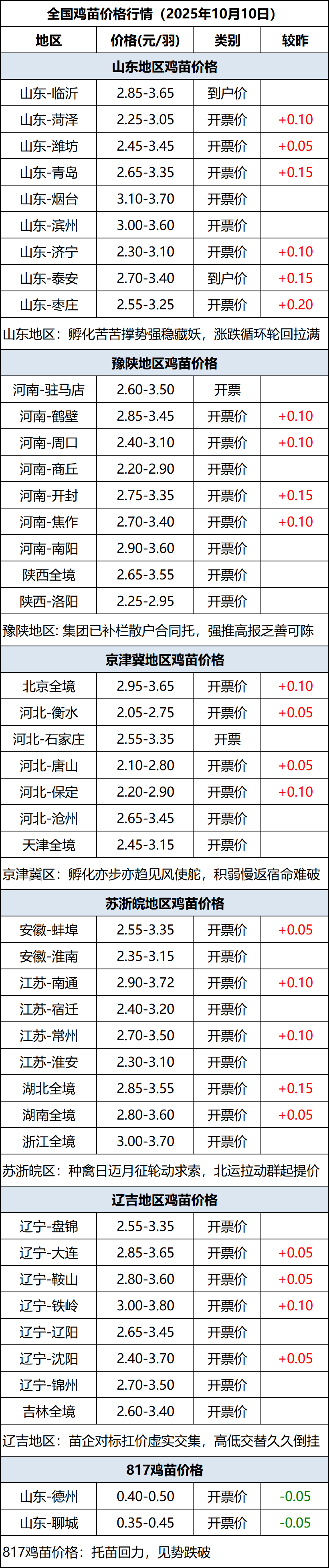 10月10日全国鸡苗(肉鸡)价格行情(涨价)