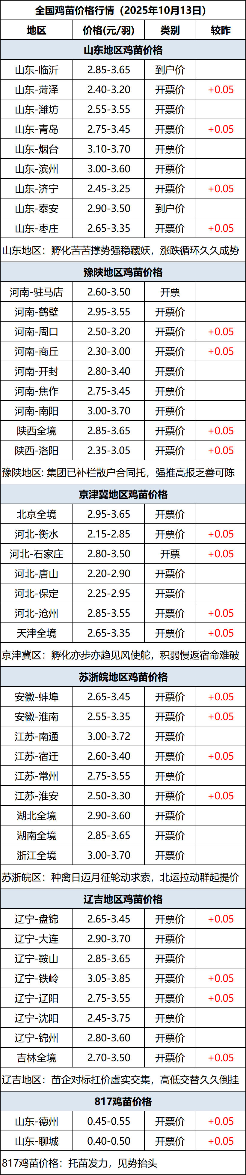 10月13日全国鸡苗(肉鸡)价格行情(涨价)