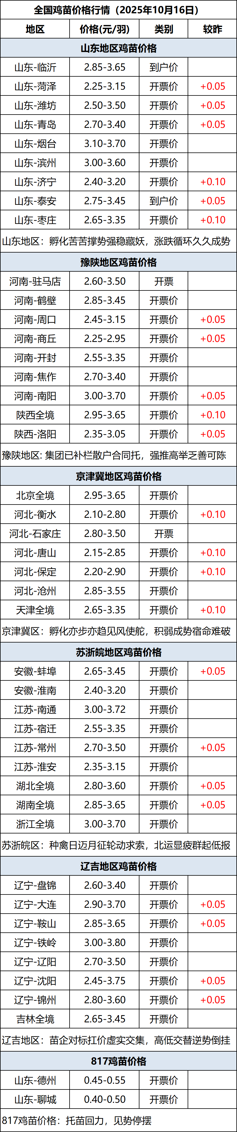 10月16日全国鸡苗(肉鸡)价格行情(涨价)