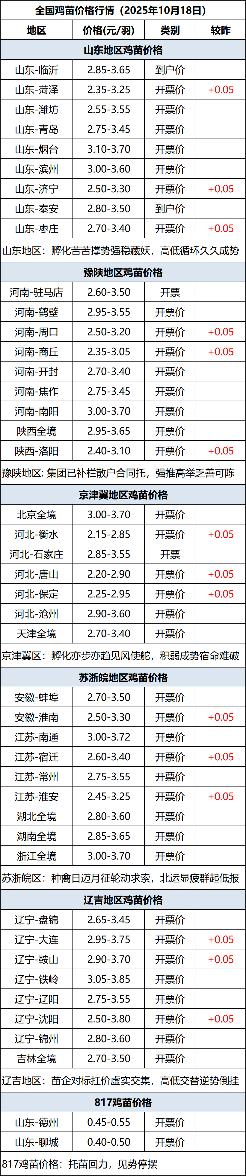 10月18日全国鸡苗(肉鸡)价格行情(涨价)