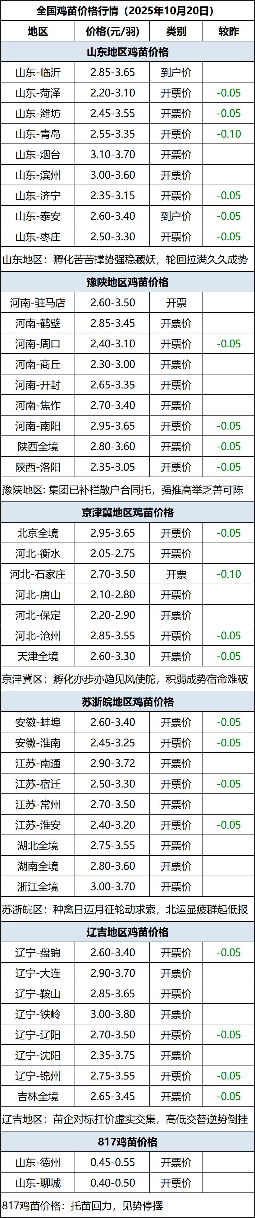 10月20日全国鸡苗(肉鸡)价格行情(落价)