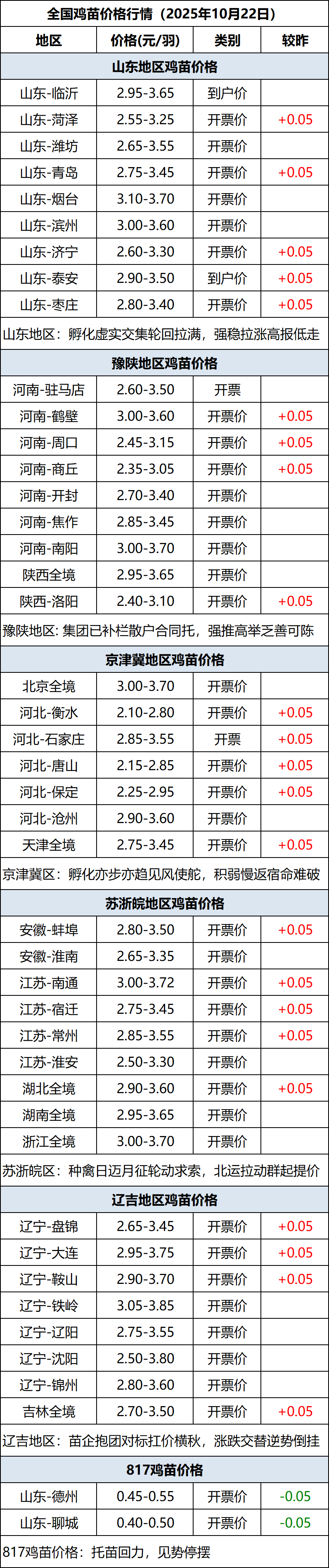 10月22日全国鸡苗(肉鸡)价格行情(涨价)