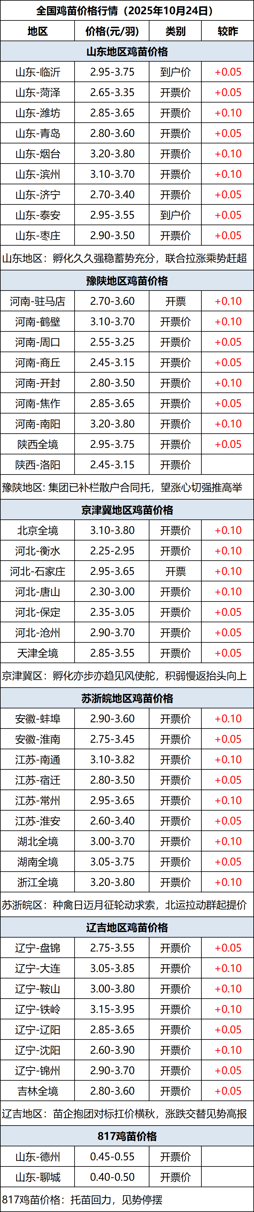 10月24日全国鸡苗(肉鸡)价格行情(涨价)