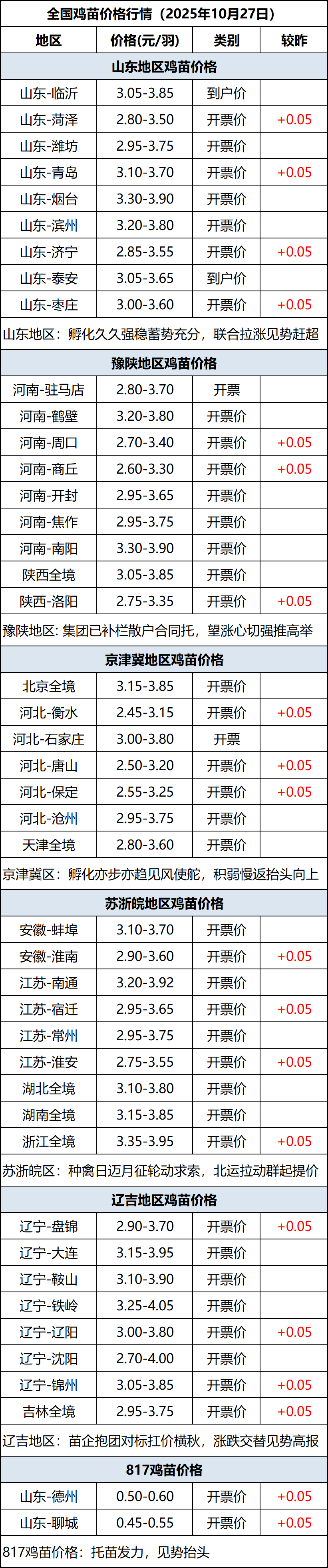 10月27日全国鸡苗(肉鸡)价格行情(涨价)