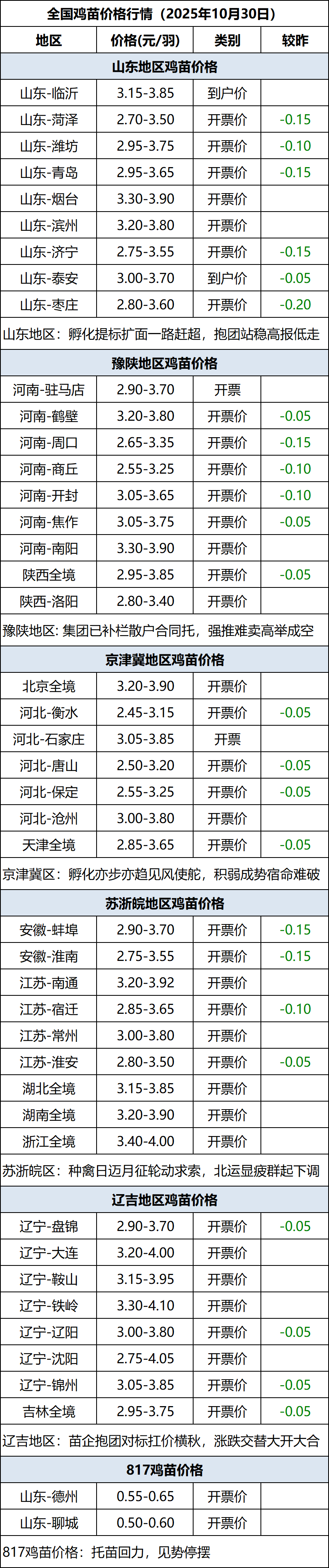10月30日全国鸡苗(肉鸡)价格行情(落价)