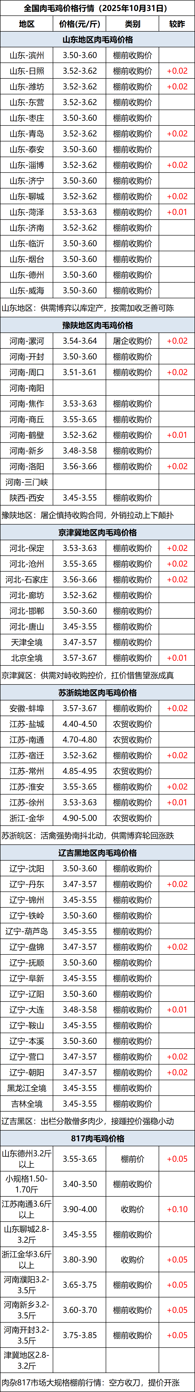 10月31日全国肉毛鸡价格行情(涨价)