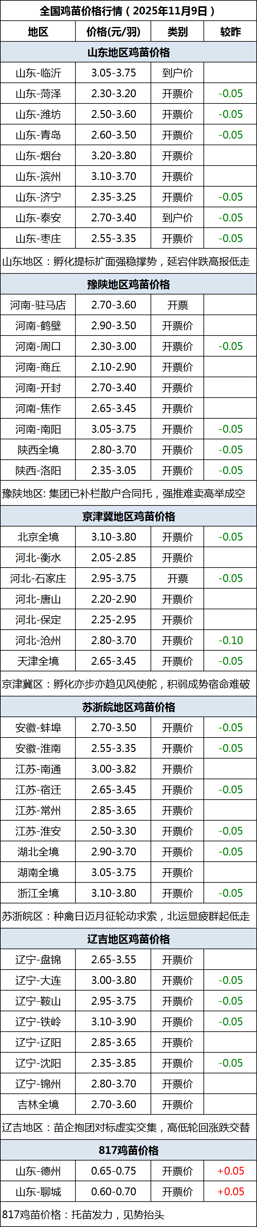 11月9日全国鸡苗(肉鸡)价格行情(落价)
