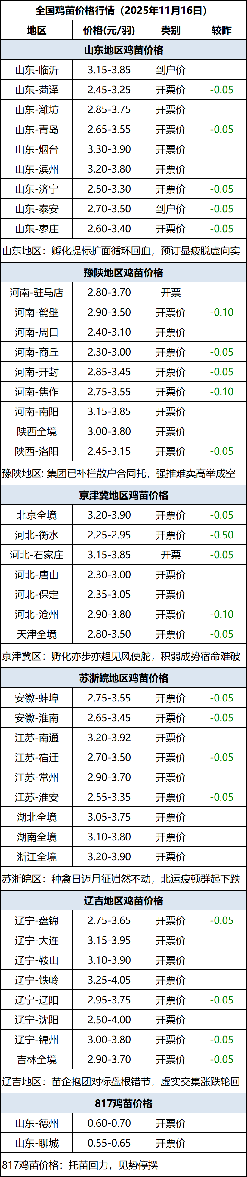 11月16日全国鸡苗(肉鸡)价格行情(落价)