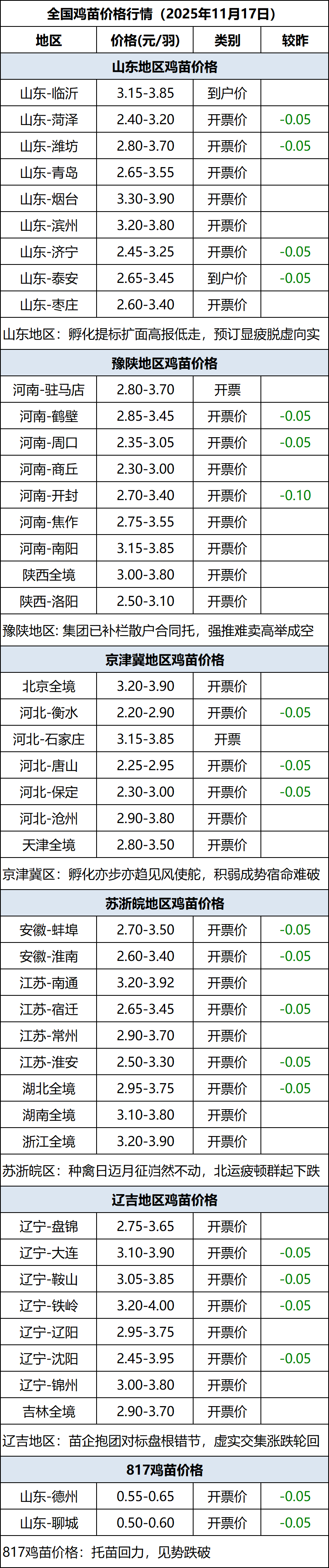 11月17日全国鸡苗(肉鸡)价格行情(落价)