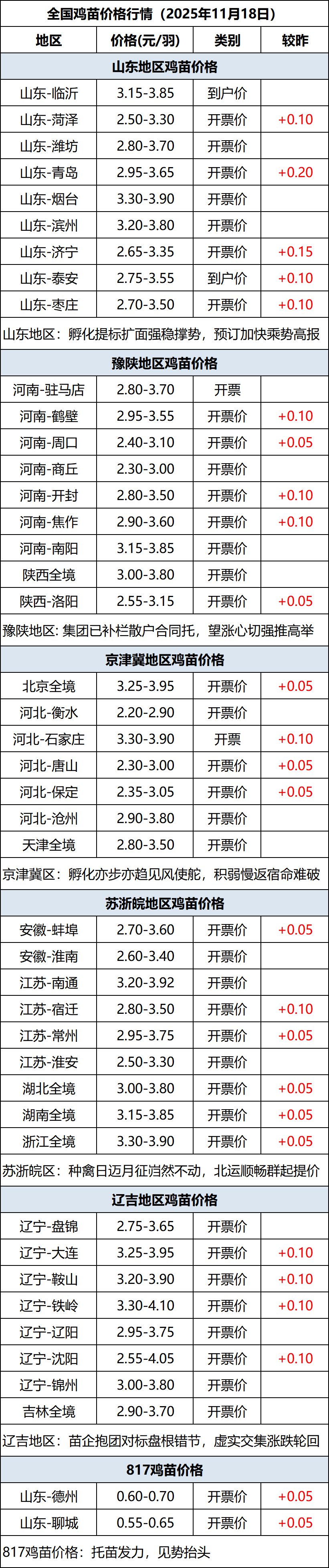11月18日全国鸡苗(肉鸡)价格行情(涨价)