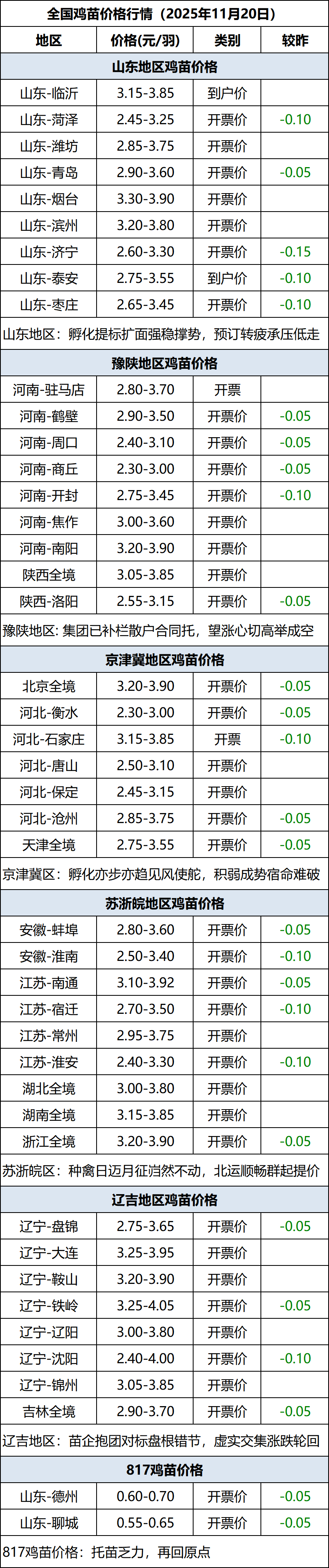 11月20日全国鸡苗(肉鸡)价格行情(落价)