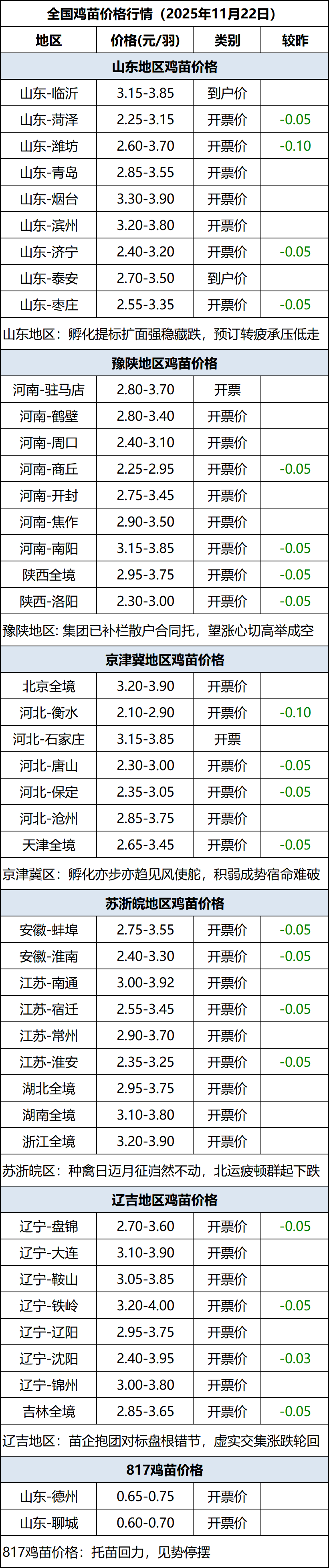 11月22日全国鸡苗(肉鸡)价格行情(落价)
