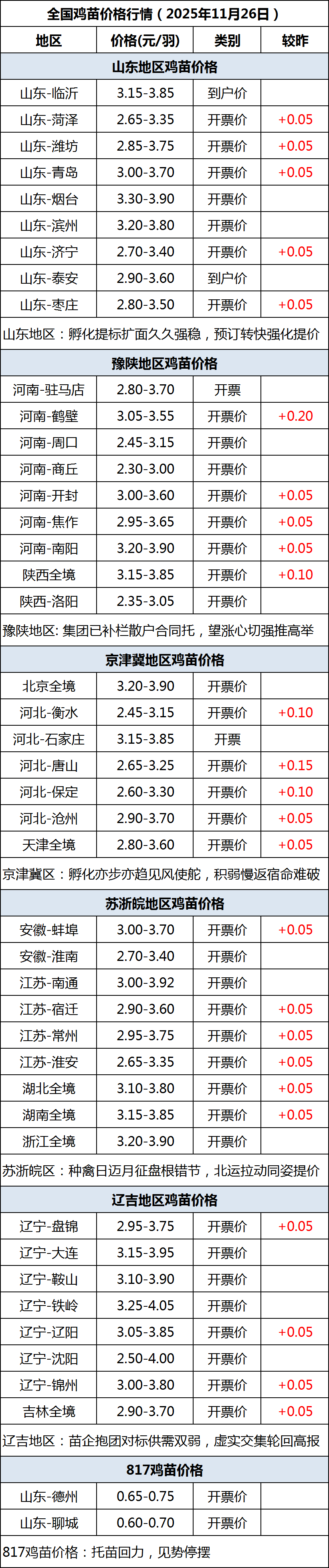 11月26日全国鸡苗(肉鸡)价格行情(涨价)