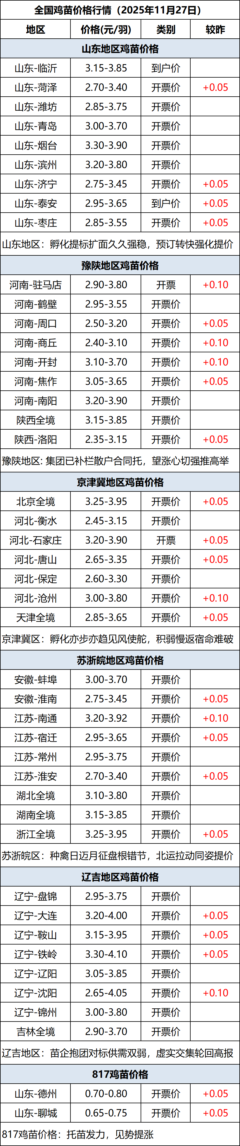 11月27日全国鸡苗(肉鸡)价格行情(涨价)