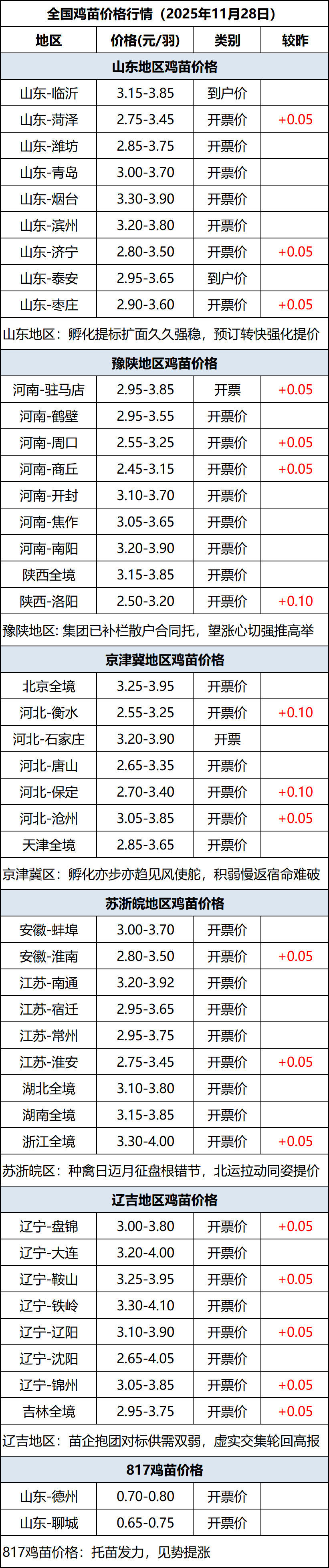 11月28日全国鸡苗(肉鸡)价格行情(涨价)