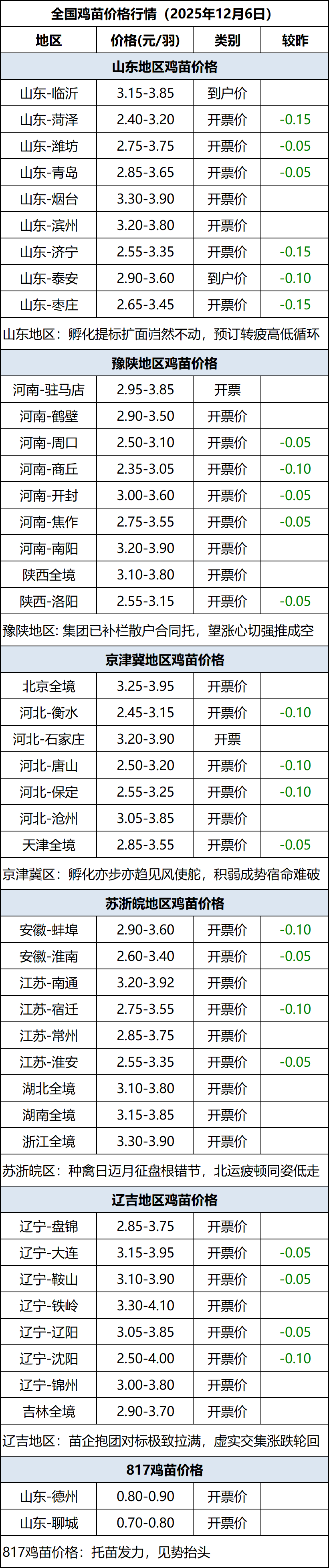 12月6日全国鸡苗(肉鸡)价格行情(落价)