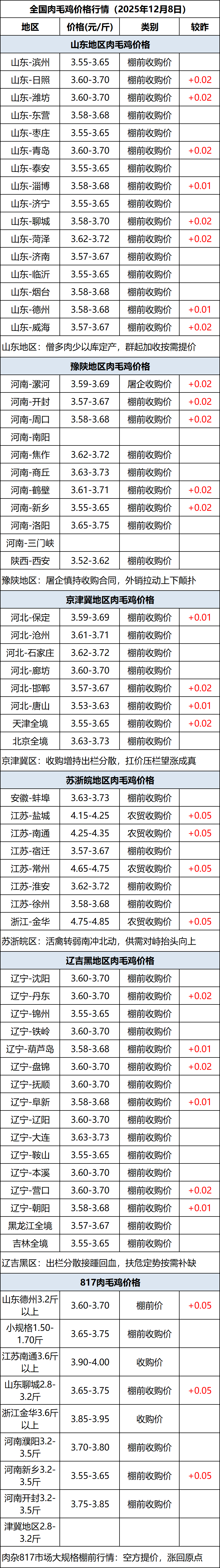 12月8日全国肉毛鸡价格行情(涨价)