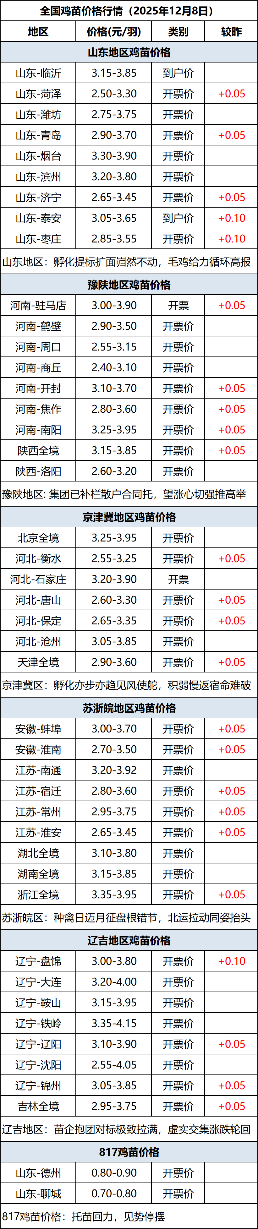 12月8日全国鸡苗(肉鸡)价格行情(涨价)