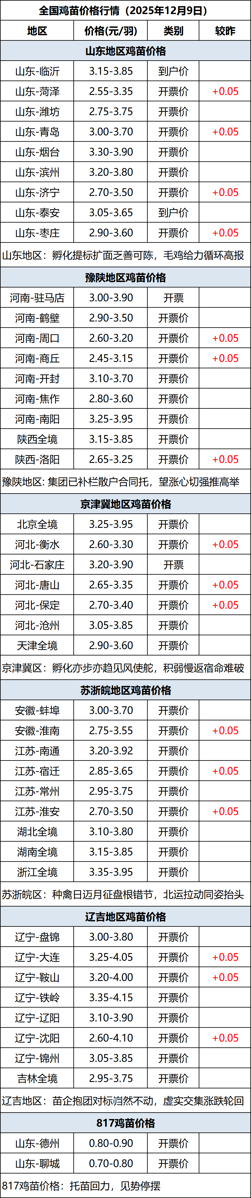 12月9日全国鸡苗(肉鸡)价格行情(涨价)