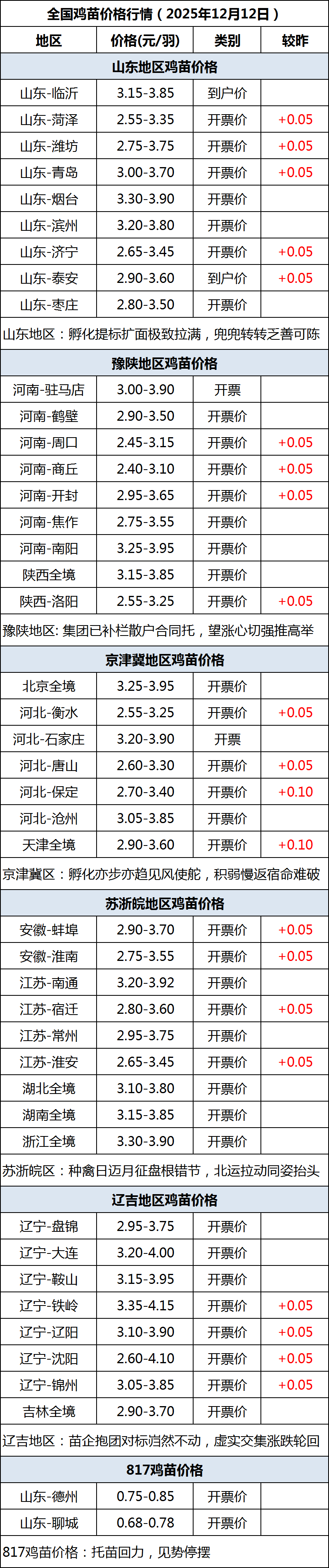 12月12日全国鸡苗(肉鸡)价格行情(涨价)
