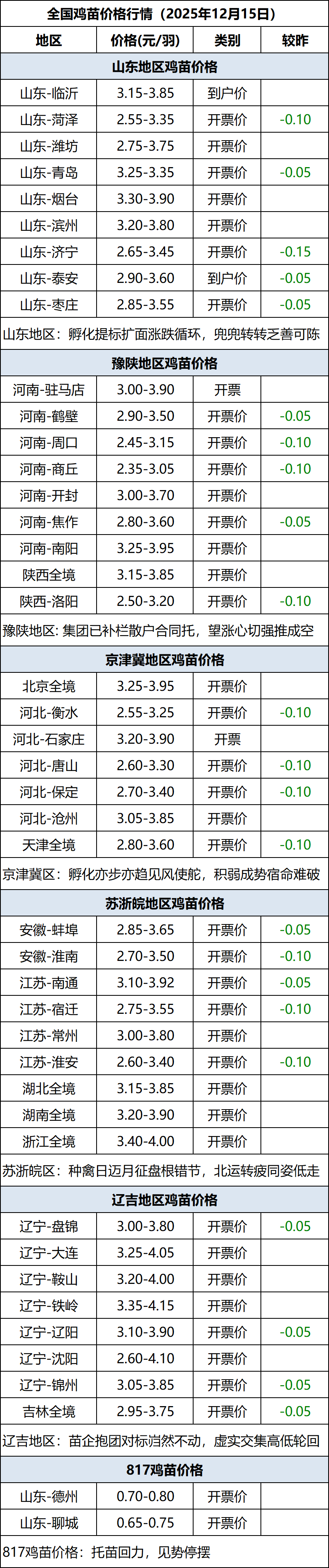 12月15日全国鸡苗(肉鸡)价格行情(落价)