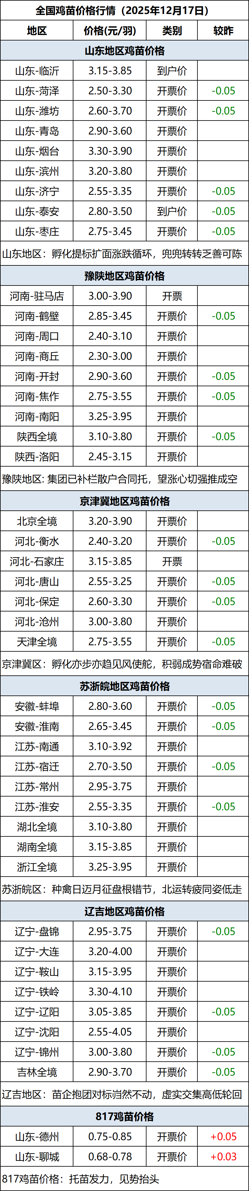 12月17日全国鸡苗(肉鸡)价格行情(落价)