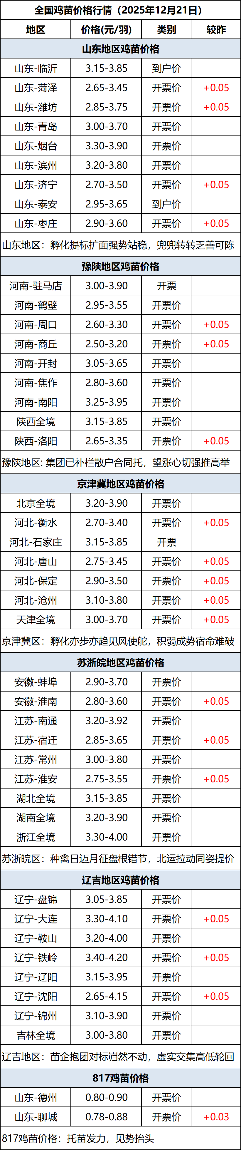 12月21日全国鸡苗(肉鸡)价格行情(涨价)
