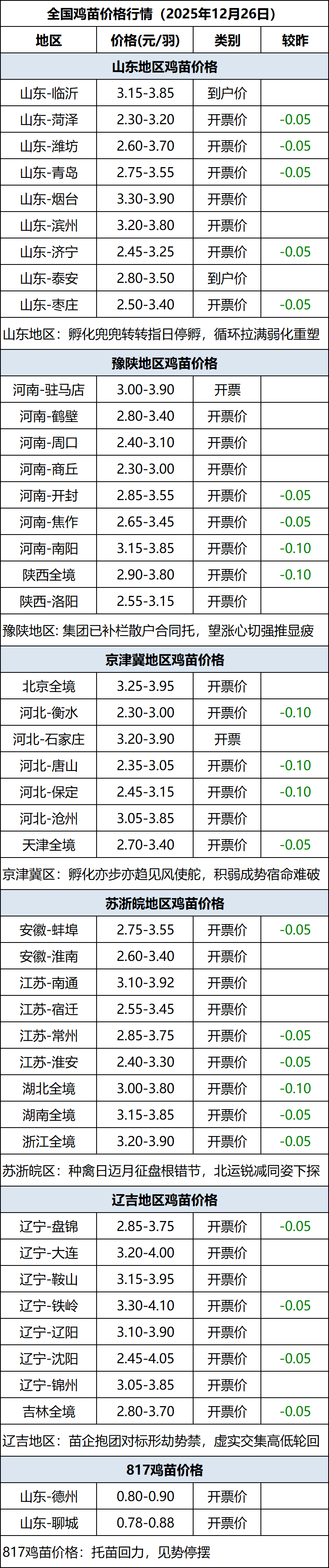 12月26日全国鸡苗(肉鸡)价格行情(落价)