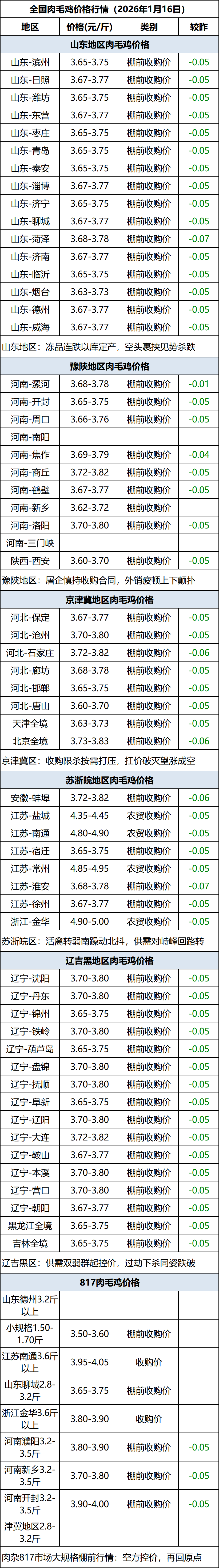 1月16日全国肉毛鸡价格行情(落价)