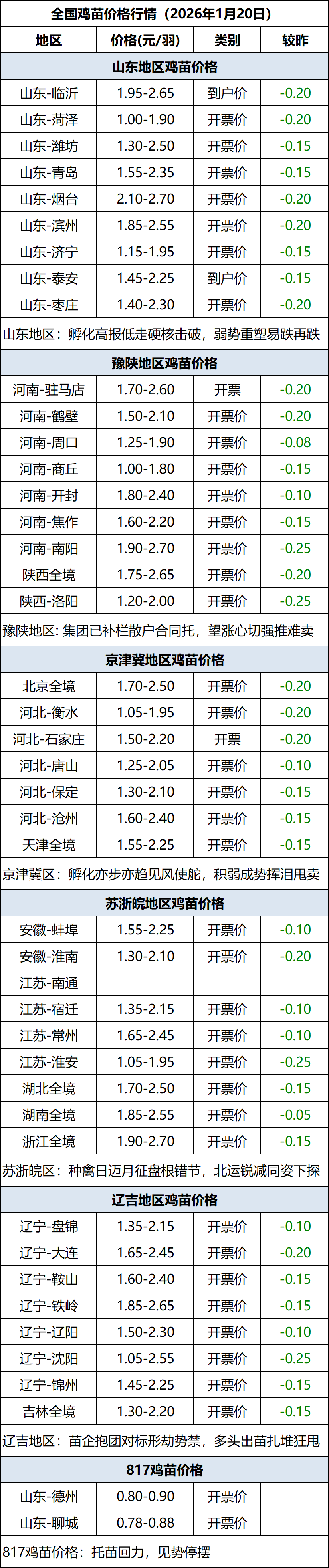 1月20日全国鸡苗(肉鸡)价格行情(落价)