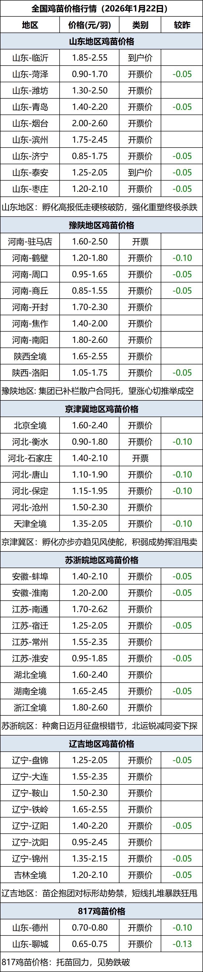 1月22日全国鸡苗(肉鸡)价格行情(落价)