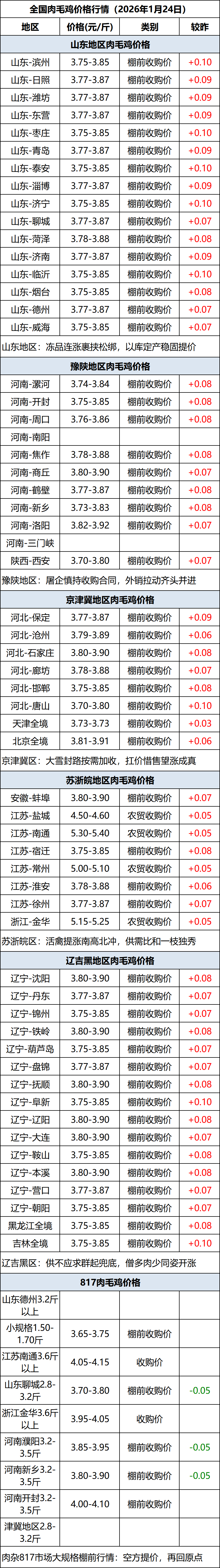 1月24日全国肉毛鸡价格行情(涨价)