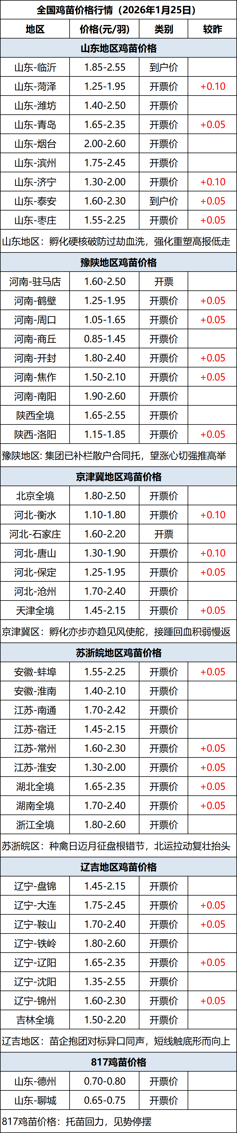 1月25日全国鸡苗(肉鸡)价格行情(涨价)