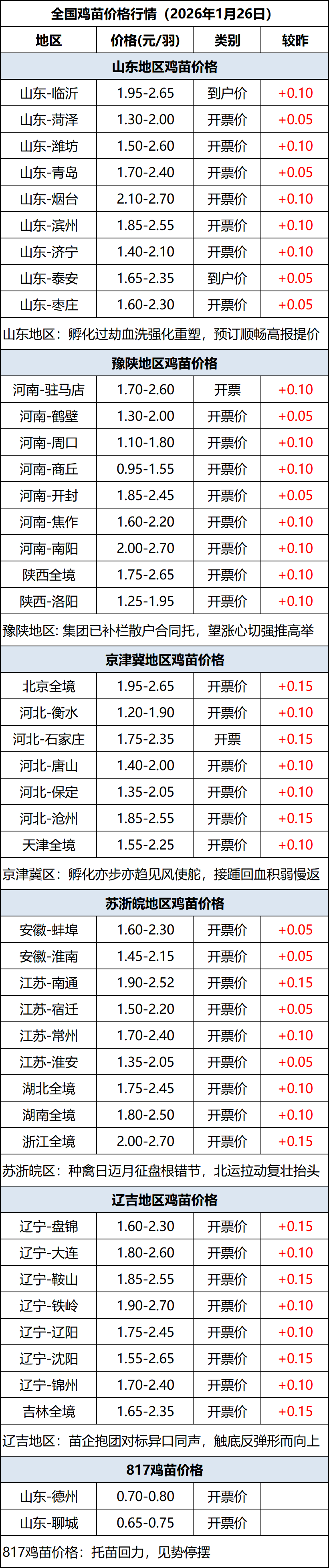 1月26日全国鸡苗(肉鸡)价格行情(涨价)