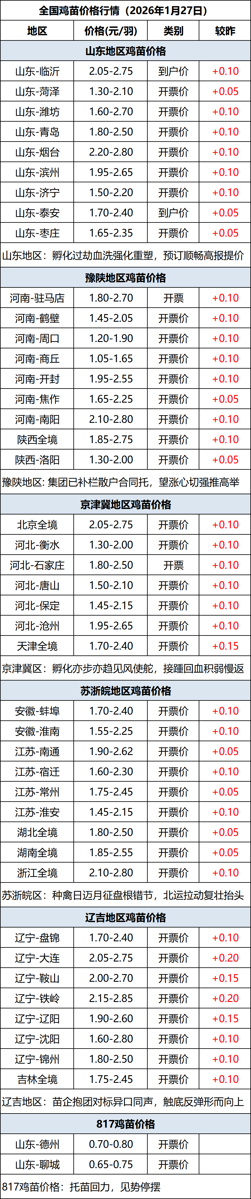 1月27日全国鸡苗(肉鸡)价格行情(涨价)