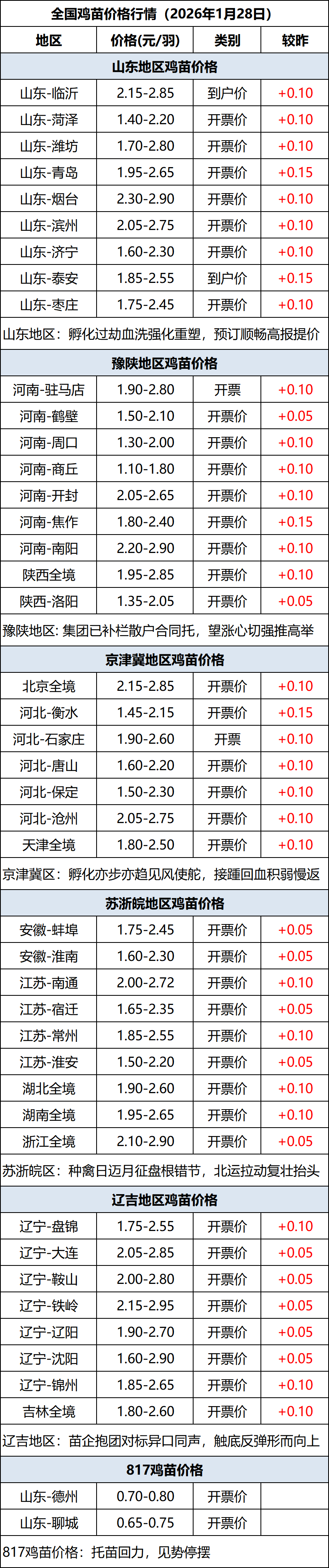 1月28日全国鸡苗(肉鸡)价格行情(涨价)