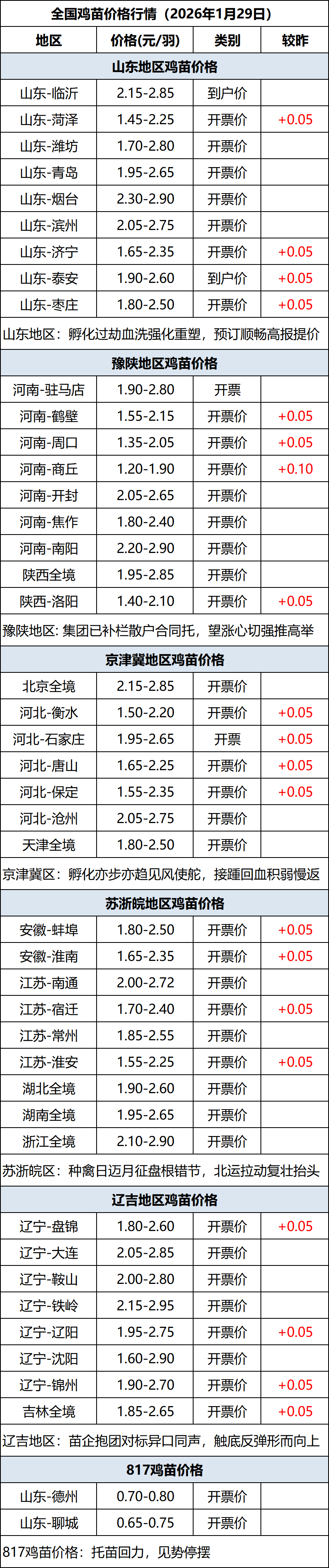 1月29日全国鸡苗(肉鸡)价格行情(涨价)