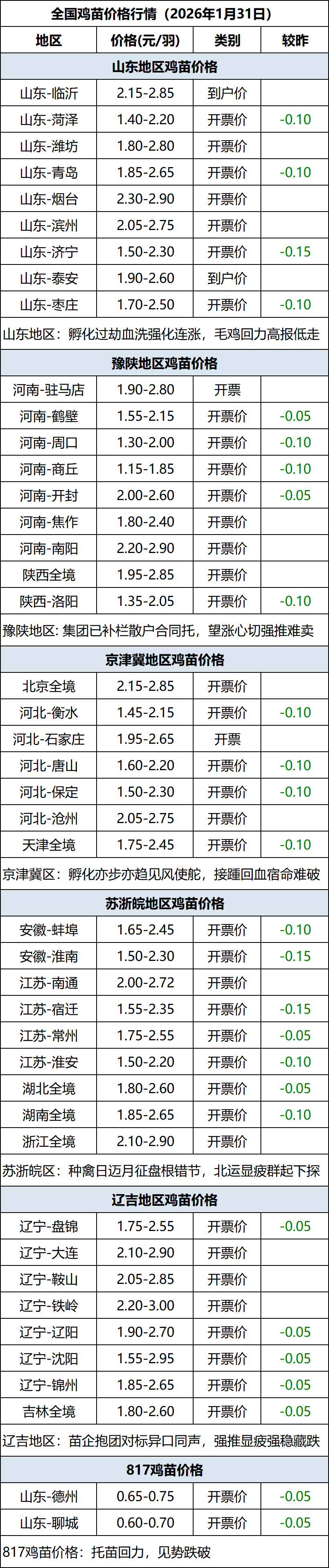 1月31日全国鸡苗(肉鸡)价格行情(落价)