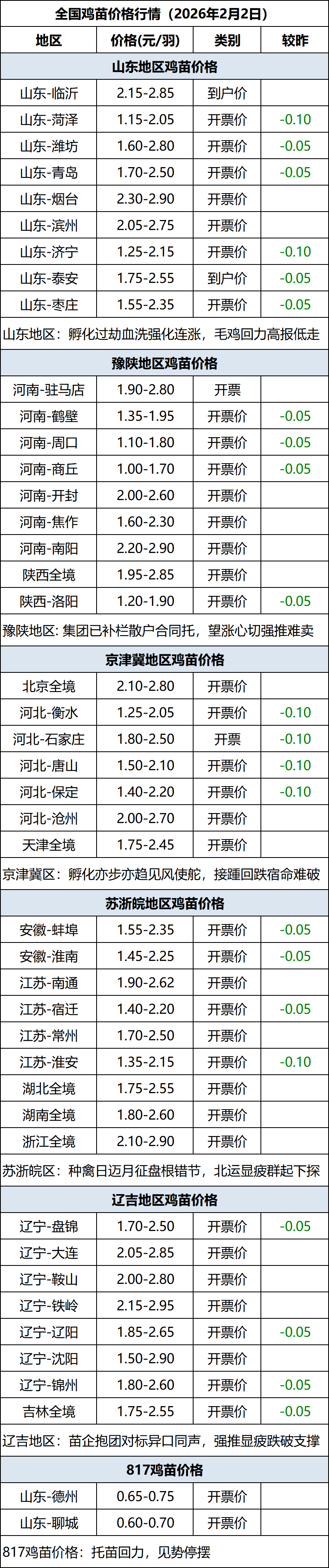 2月2日全国鸡苗(肉鸡)价格行情(落价)